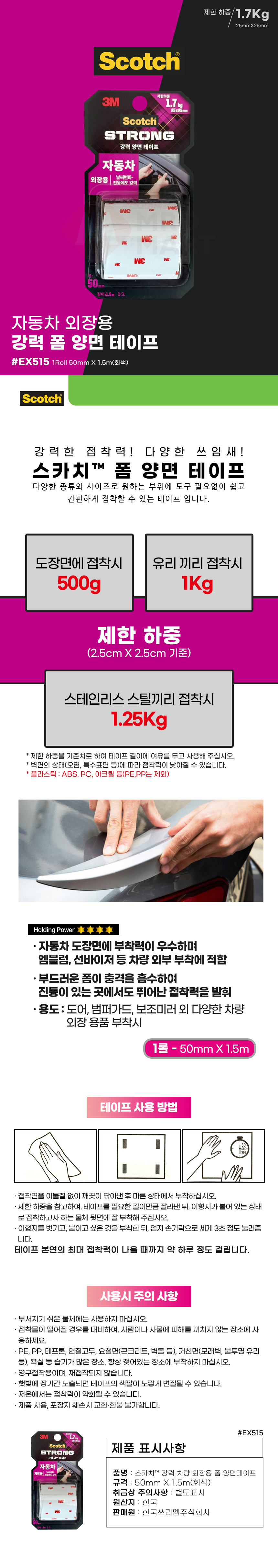 3M 스카치 자동차 외장용 강력 폼 양면 테이프 EX515 1롤 50mmX1.5m 회색