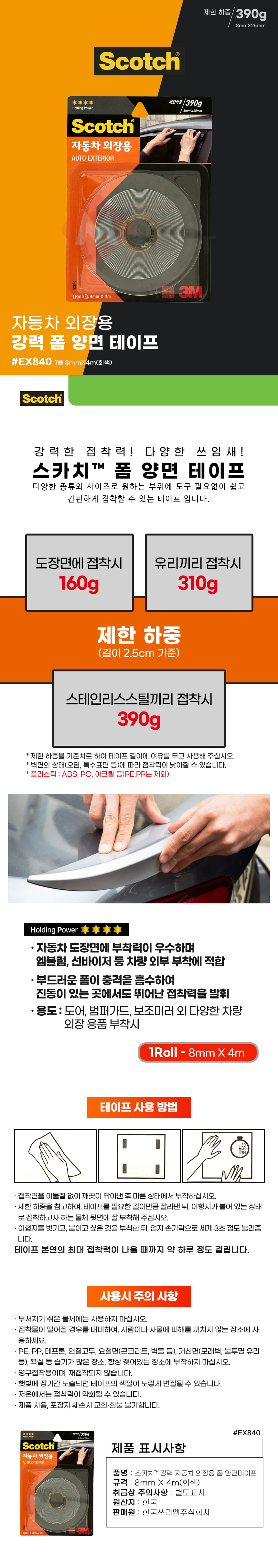 3M 스카치 자동차 외장용 강력 폼 양면 테이프 EX840 1롤 8mmX4m 회색