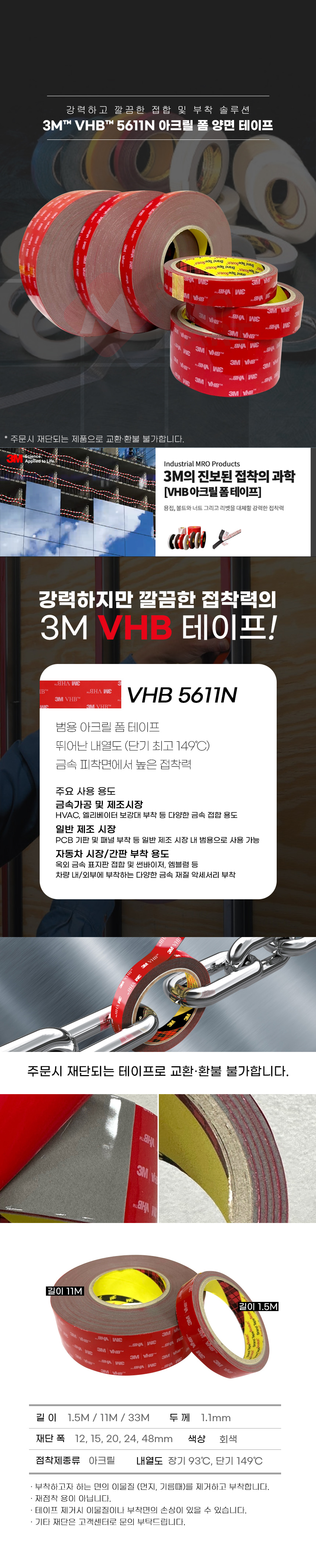 3M VHB 5611N 아크릴 폼 양면 테이프 11M 회색