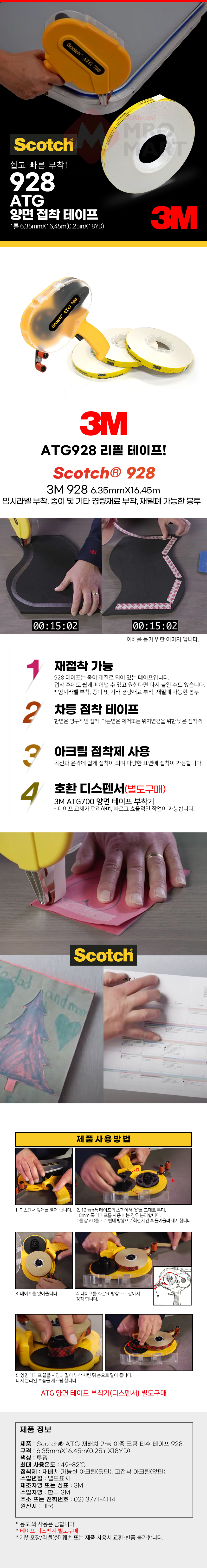 3M 스카치 ATG 부직포 양면 접착 테이프 928 1롤 6.35mmX16.45m ATG700 디스펜서 리필 교체용