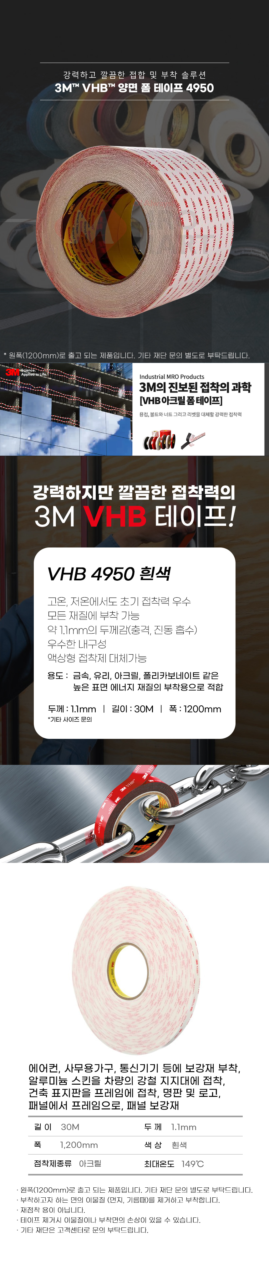 3M VHB 4950 아크릴 폼 양면 테이프 1200mmX30M