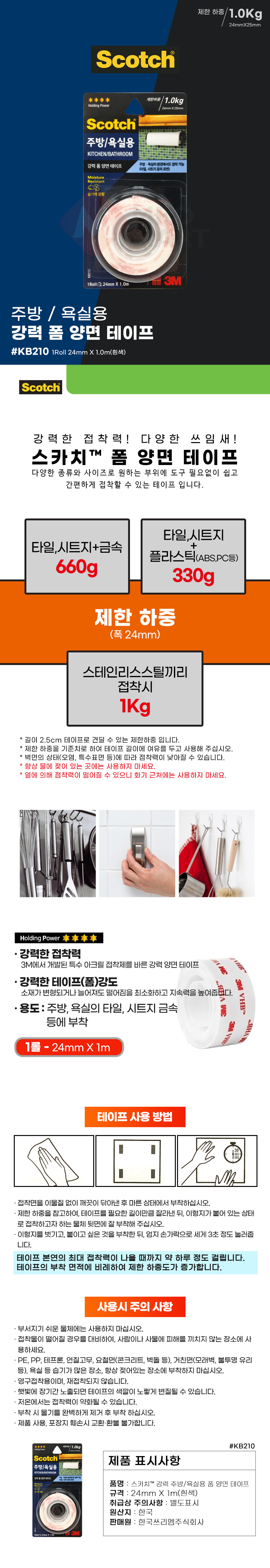 3M 스카치 KB210 주방 욕실용 강력 폼 양면 테이프 1롤 24mmX1m 타일 시트지 벽면