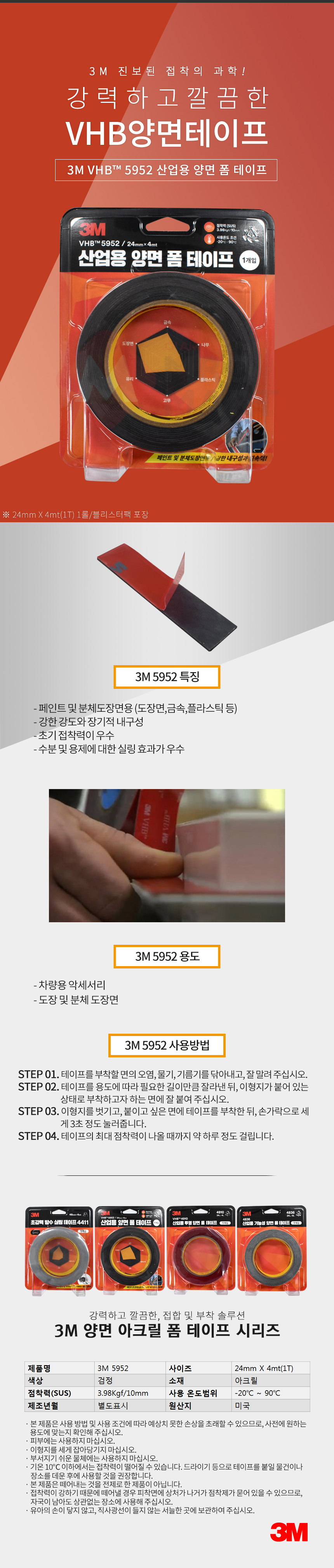 3M VHB 5952 산업용 양면 폼 테이프 24mmX4mt 1롤 블리스터팩 다용도 차량 도장 금속 플라스틱