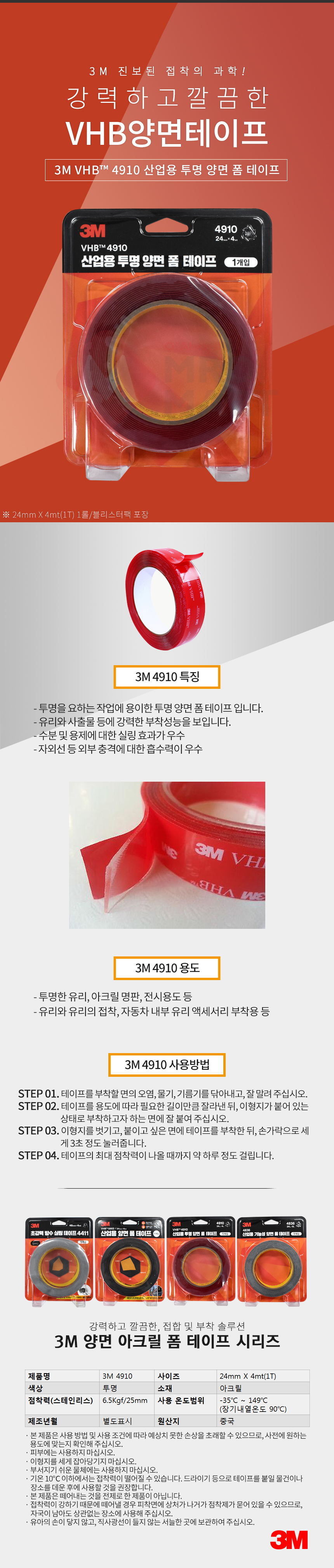 3M VHB 4910 산업용 투명 양면 폼 테이프 24mmX4mt 1롤 블리스터팩