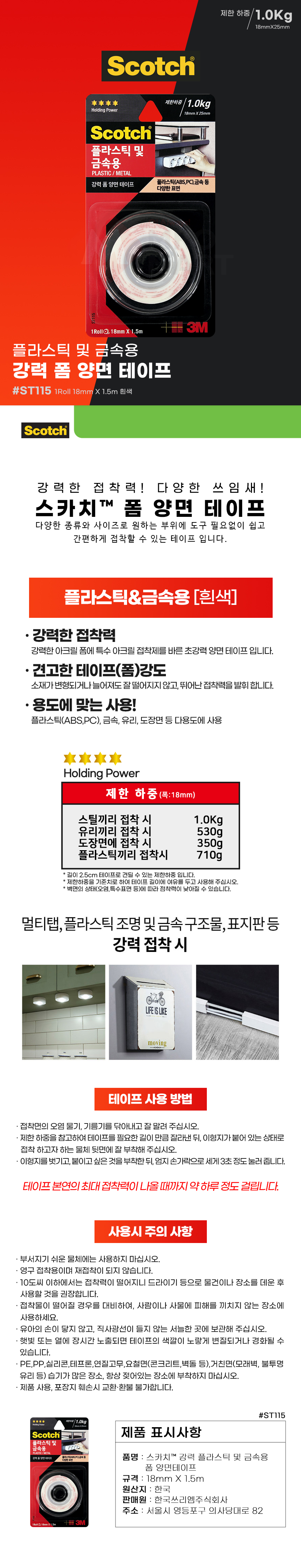 3M ST115 강력 폼 양면 테이프 흰색 1롤 18mmX1.5m 플라스틱 ABS PC 금속