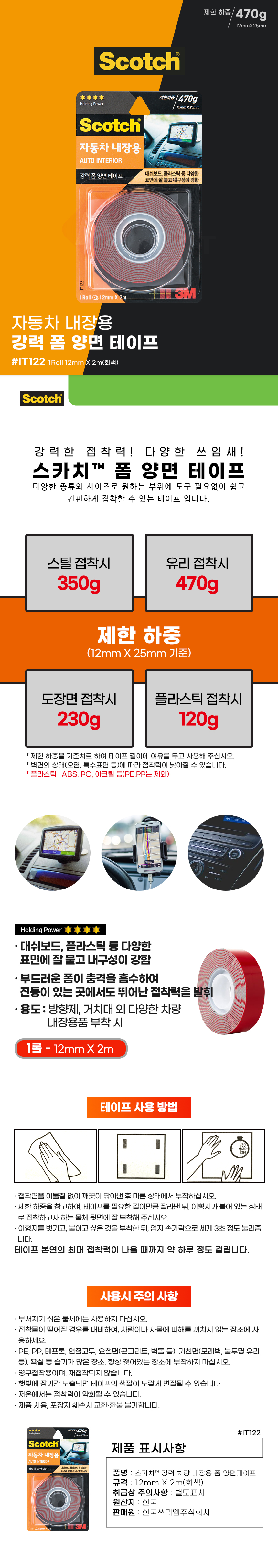 3M IT122 강력 폼 양면 테이프 회색 1롤 12mmX2m 자동차 내장용 대쉬보드 플라스틱