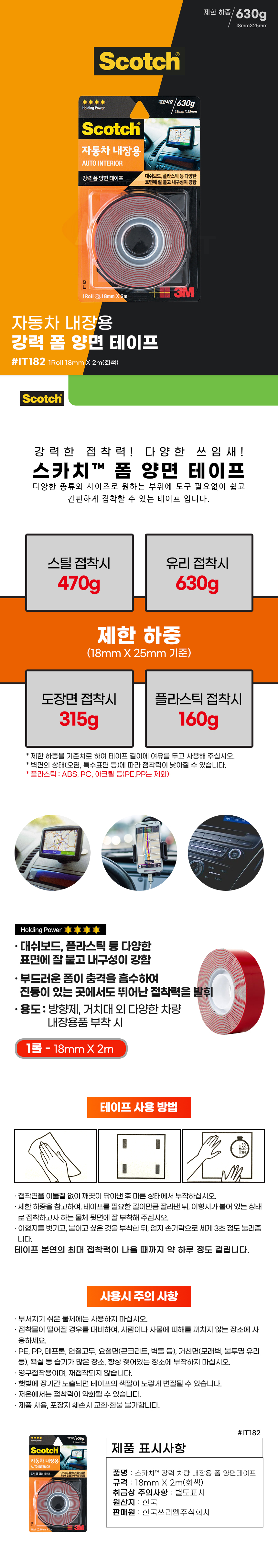 3M IT182 강력 폼 양면 테이프 회색 1롤 18mmX2m 자동차 내장용 대쉬보드 플라스틱