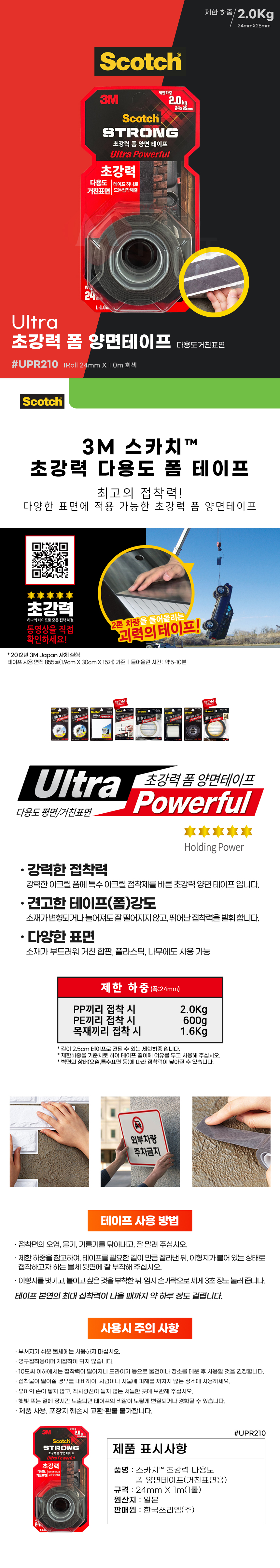 3M 스카치 울트라 UPR210 초강력 폼 양면 테이프 24mmX1m 1롤 다용도 거친 표면 나무 합판 플라스틱