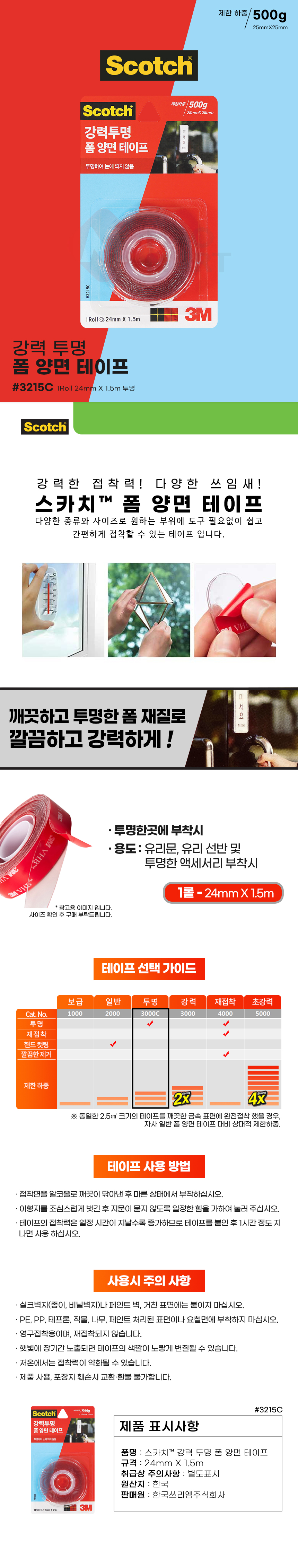 3M 스카치 3215C 강력 투명 폼 양면 테이프 24mmX1.5M 부착 고정 다용도