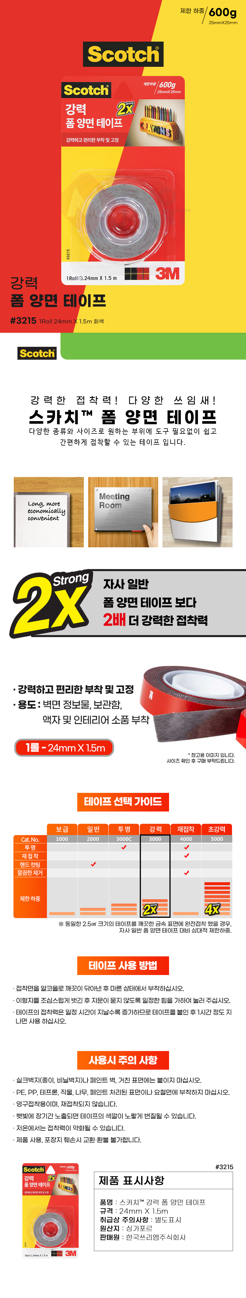 3M 스카치 3215 강력 폼 양면 테이프 회색 24mmX1.5M 부착 고정 다용도