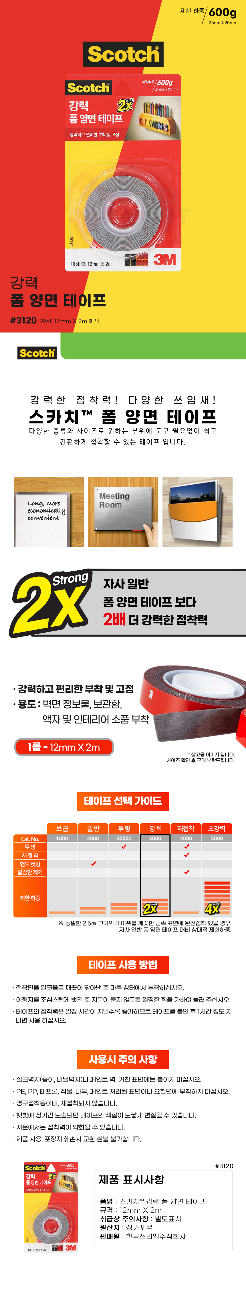 3M 스카치 3120 강력 폼 양면 테이프 회색 12mmX2M 부착 고정 다용도