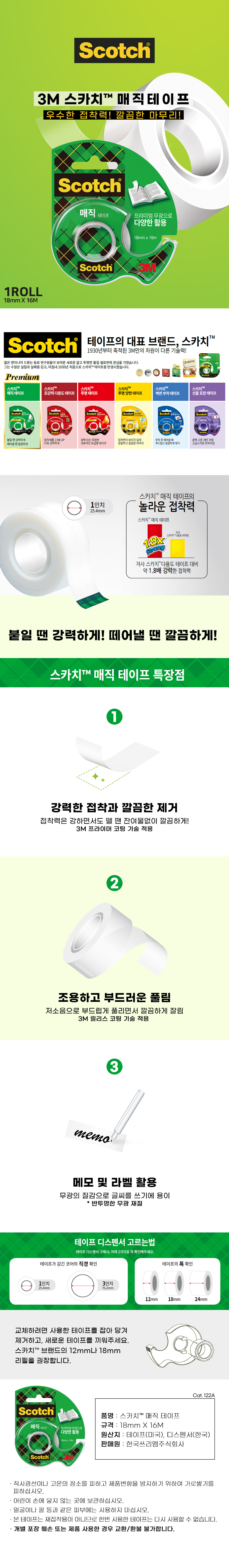 3M 스차키 매직 테이프 디스펜서 18mmX16m 122A 1인치 코어 사무 문구 반투명 무광 다용도