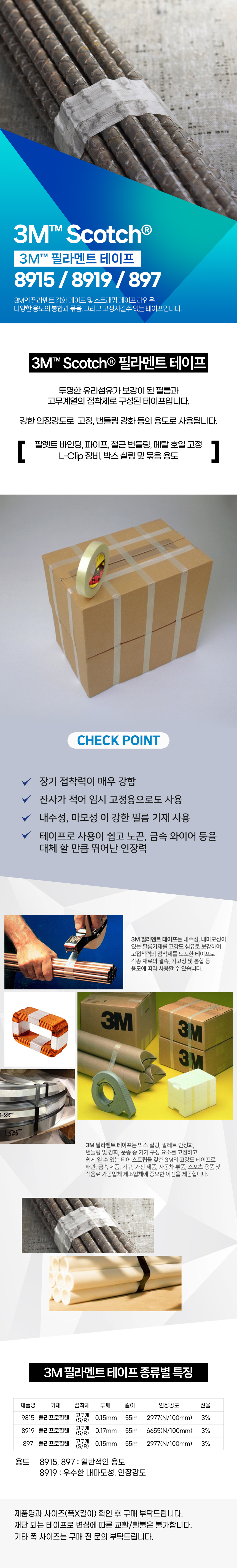 3M 무잔사 필라멘트 테이프 8915 투명 유리섬유 묶음 고정 포장 실링