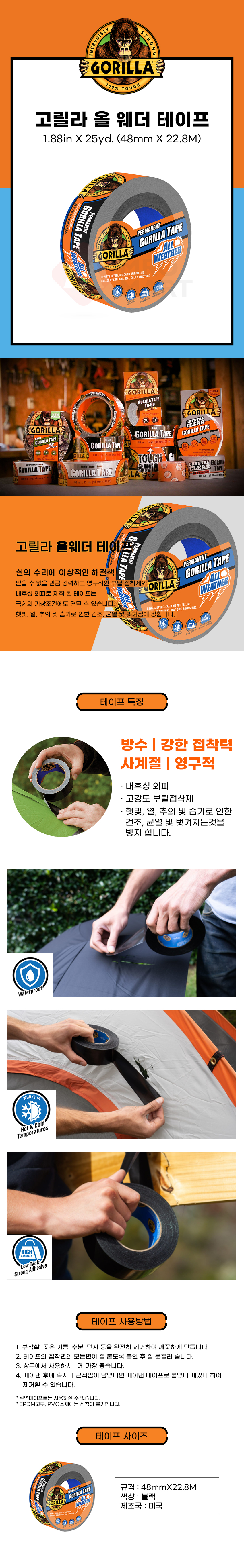 고릴라 올웨더 테이프 48mmx22M 접착 블랙 사계절 강력 천막 방수 보수