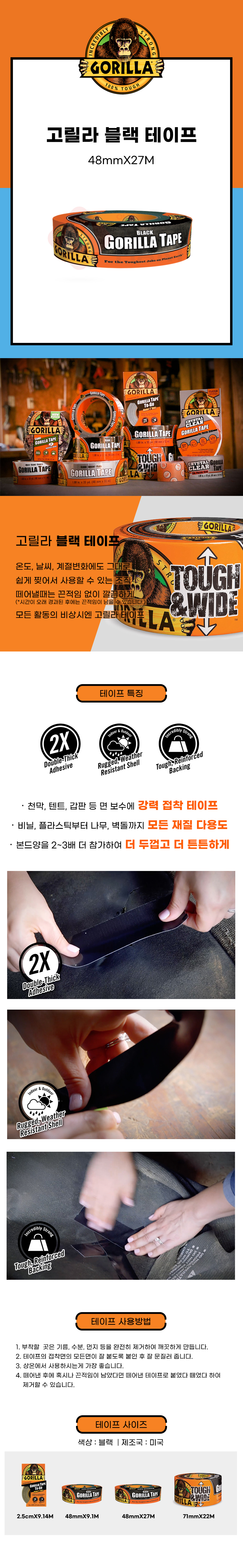 고릴라 블랙 테이프 48mmx27M 덕 덕트 강력 보수 텐트 배관