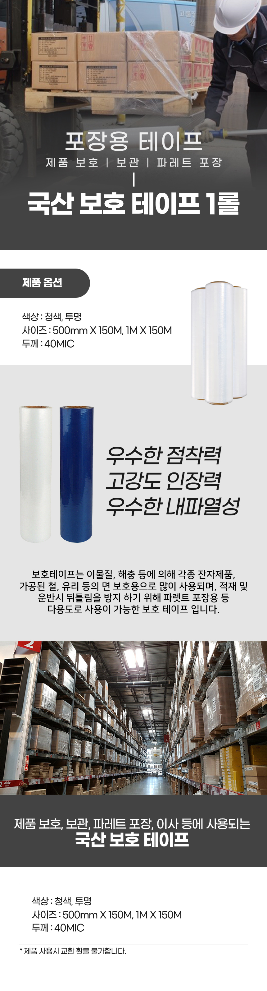 국산 보호테이프 청색 투명 500mmX150M 40MIC 1롤 스트레치 필름 포장 랩 비닐 공업용 파레트 파렛트