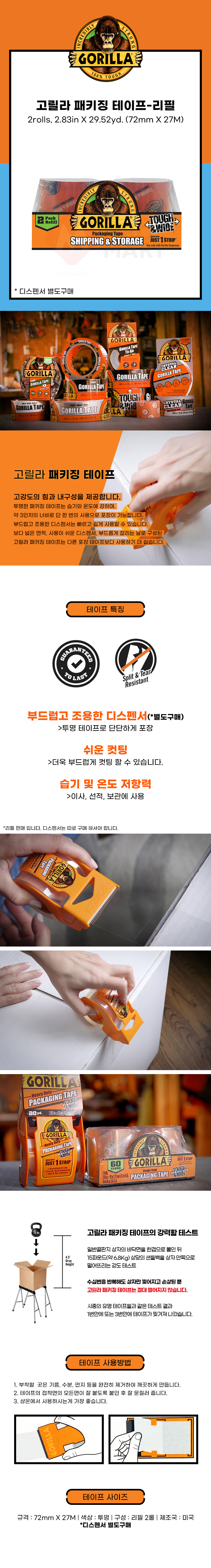 고릴라 패키징 테이프 투명 강력 포장 이사 박스테이프 2롤 리필용