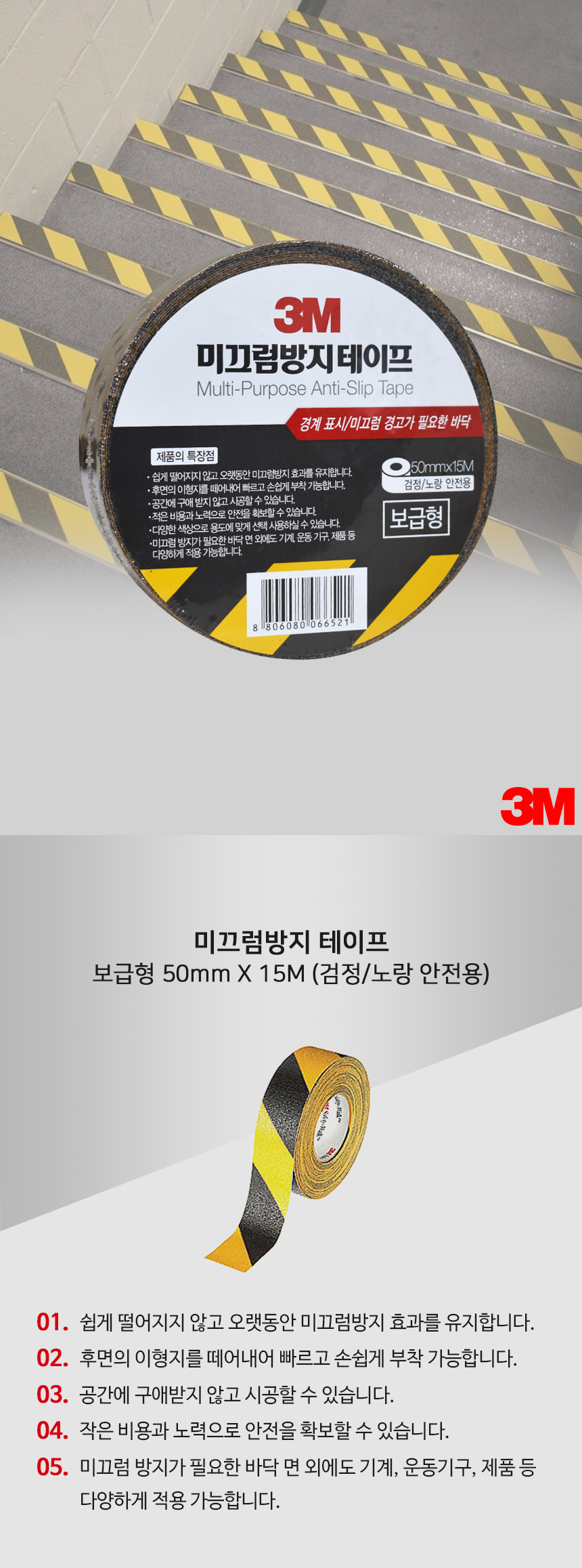 3M 논슬립 미끄럼방지 테이프 보급형 검정/노랑 사선 안전용 50mmX15M