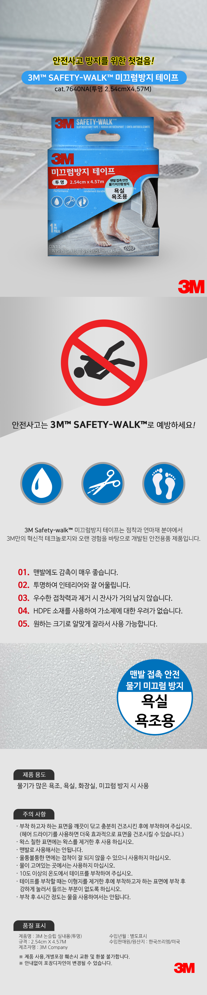 3M 7640 논슬립 미끄럼방지 테이프 2.54cmX4.57M 욕실 욕조 롤형 투명