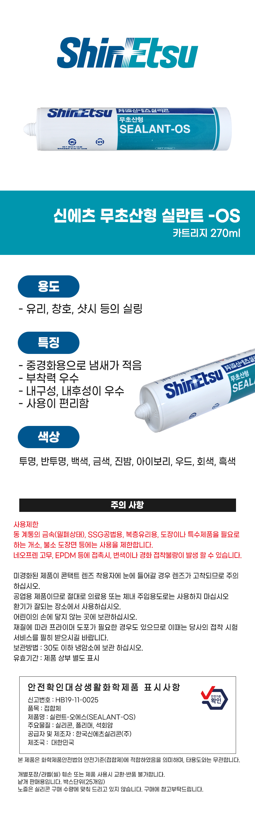 신에츠 무초산 실리콘 실란트 OS 실내 인테리어 유리 창호 샷시 실링 270ml 흑색