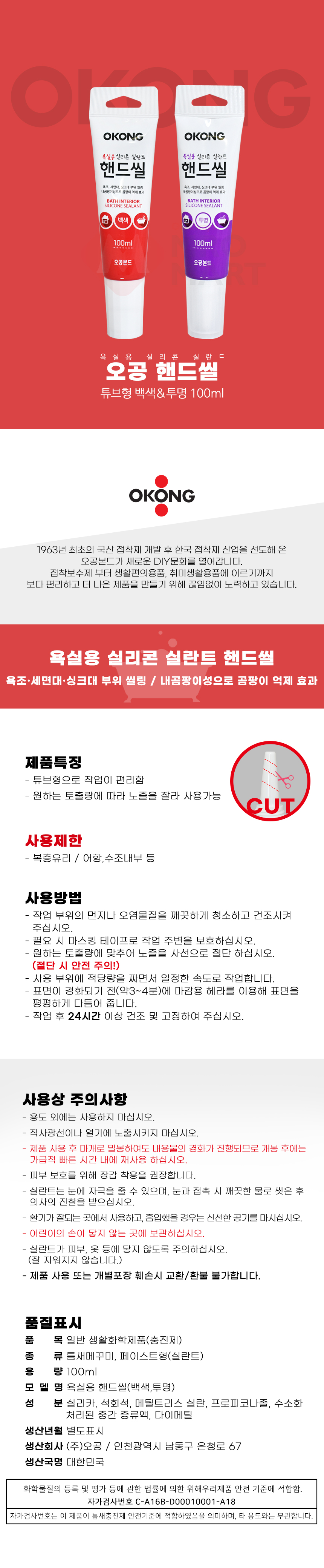 오공 욕실용 실리콘 실란트 핸드씰 100ml 내곰팡이성 바이오