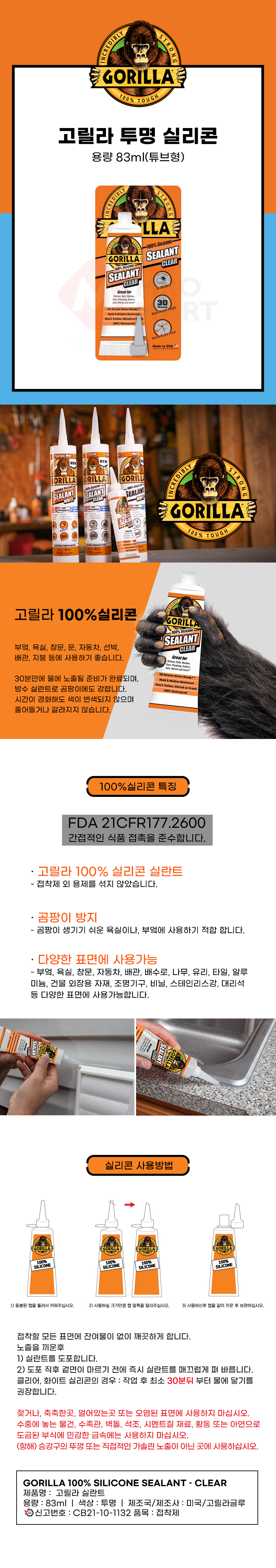 고릴라 튜브 실리콘 83ml 투명 실란트 방수 바이오 곰팡이 화장실 주방