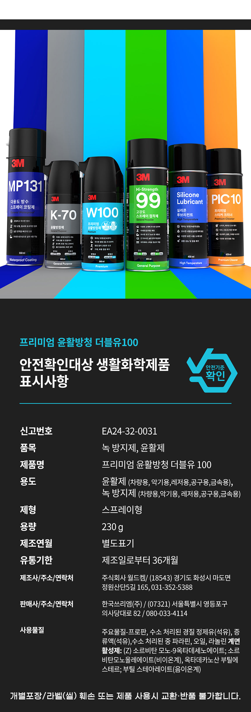 3M W100 프리미엄 윤활 방청제 360ml 녹방지 기계윤활 잡음제거 식물성 방청 성분