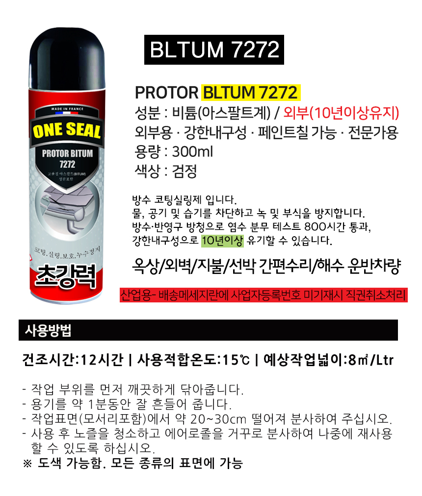 원씰 뿌리는 초강력 방수제 흑색 300ml BLTUM7272 방수코팅제 실내 실외