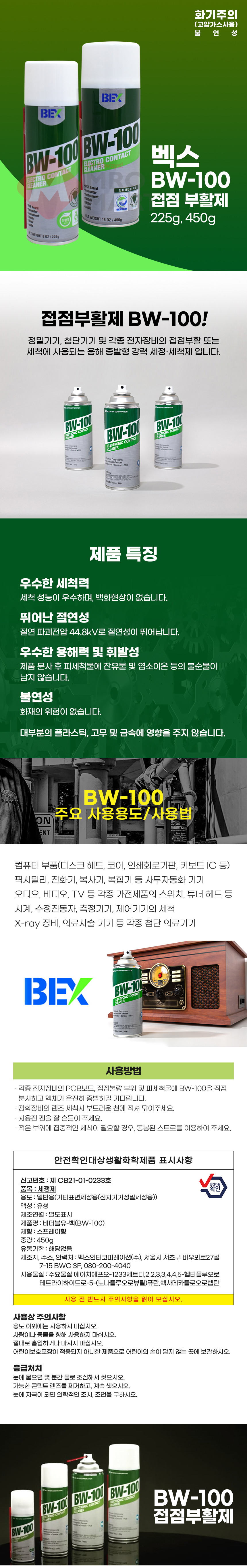 벡스 접점 부활제 세정제 BW-100 450g 전기 가전 컴퓨터 카메라 시계 부품 세척