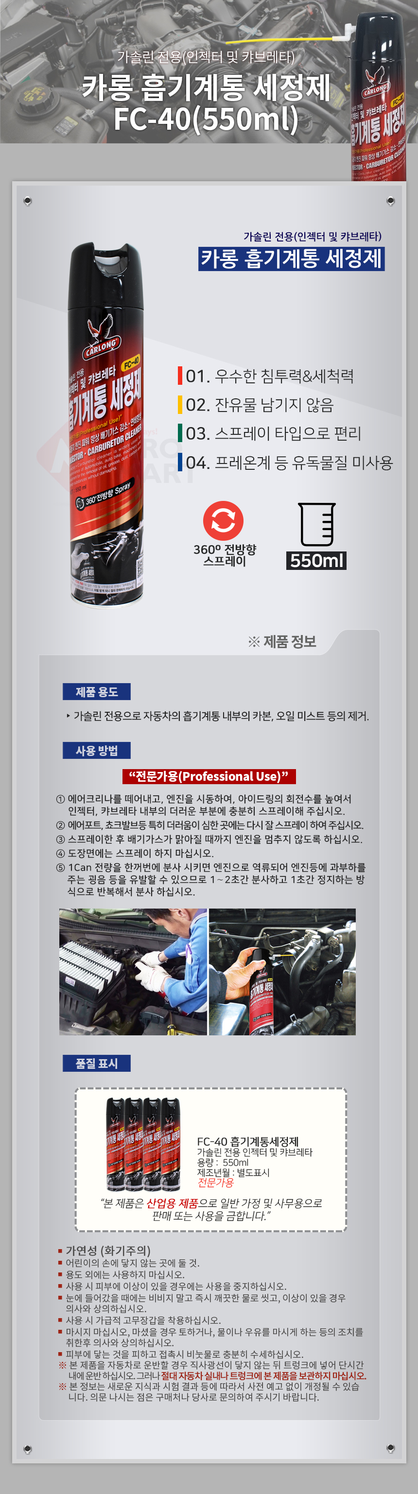 카롱 흡기계통세정제 550ml FC-40 가솔린 전용 인젝터 및 캬브레타 전문가용