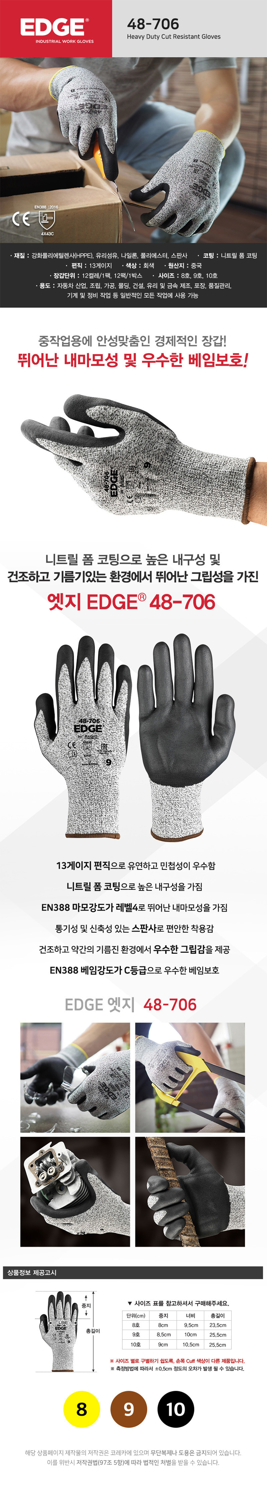 안셀 엣지 48-706 1켤레 산업 안전 장갑 니트릴 코팅 HPPE 스판덱스 절단방지
