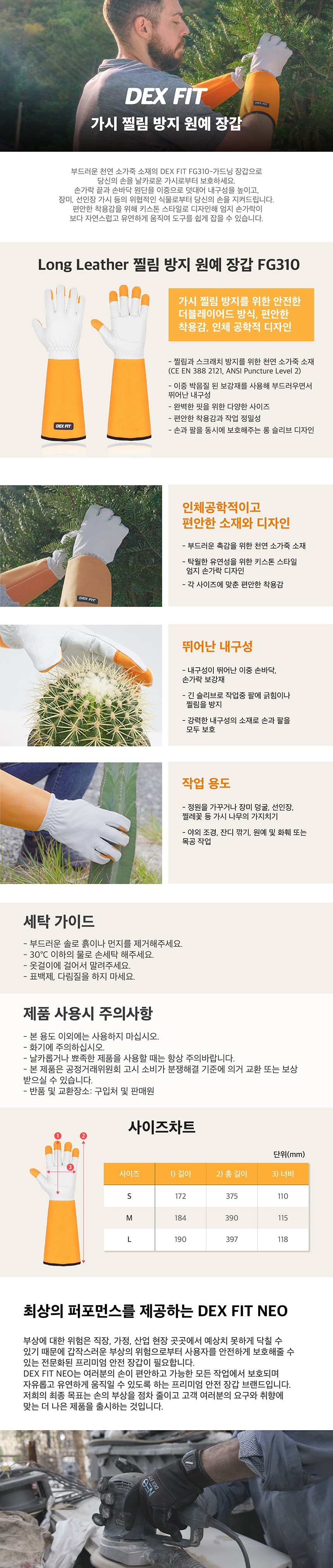 덱스핏 가시 찔림 방지 원예 장갑 FG310 롱 가죽 가드닝 정원 조경 목공 작업