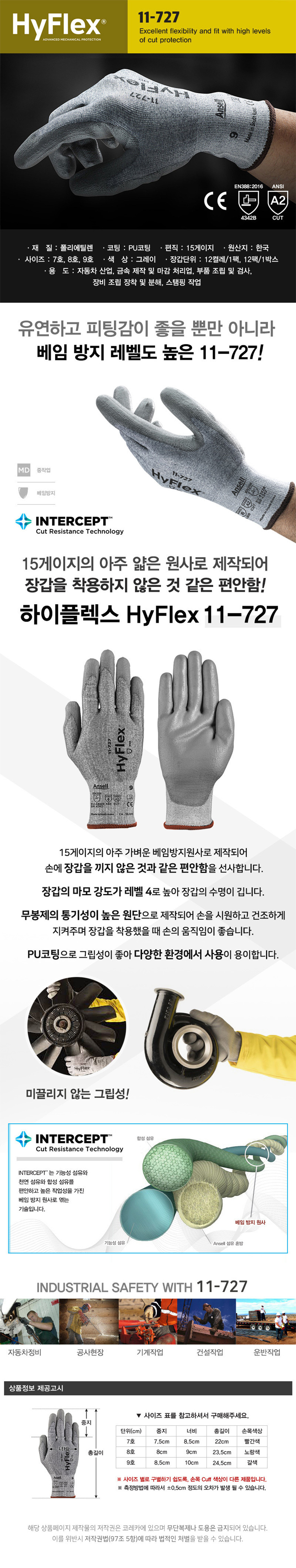 안셀 하이플렉스 11-727 1켤레 컷3 절단 베임 방지 장갑 산업 안전 작업용 PU 코팅