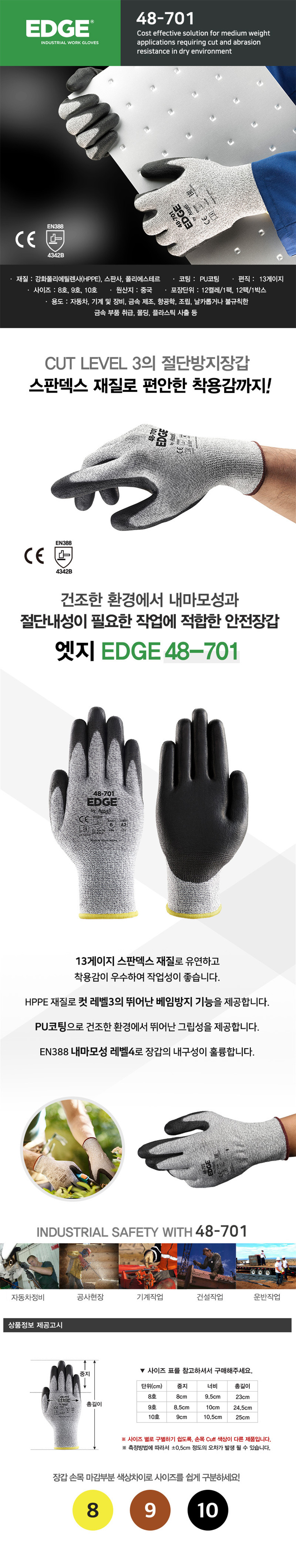 안셀 엣지 48-701 1켤레 컷3 절단 베임 방지 장갑 산업 안전 작업용 PU 코팅