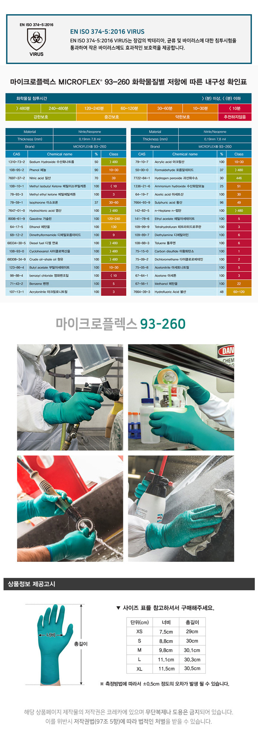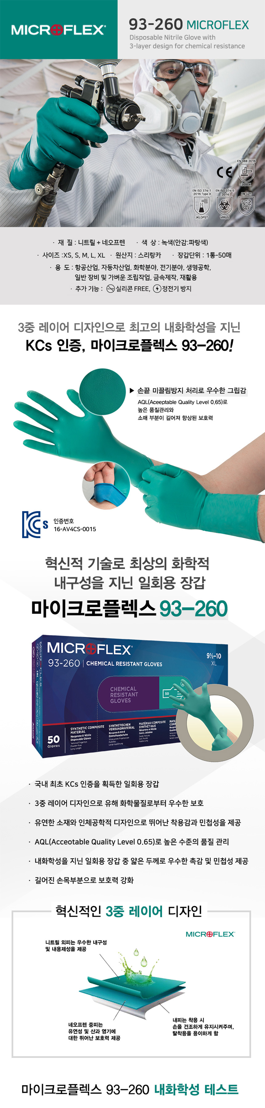 안셀 마이크로플렉스 내화학 장갑 93-260 50매입 일회용 네오프렌 고무 라텍스 케미컬 실험실 병원