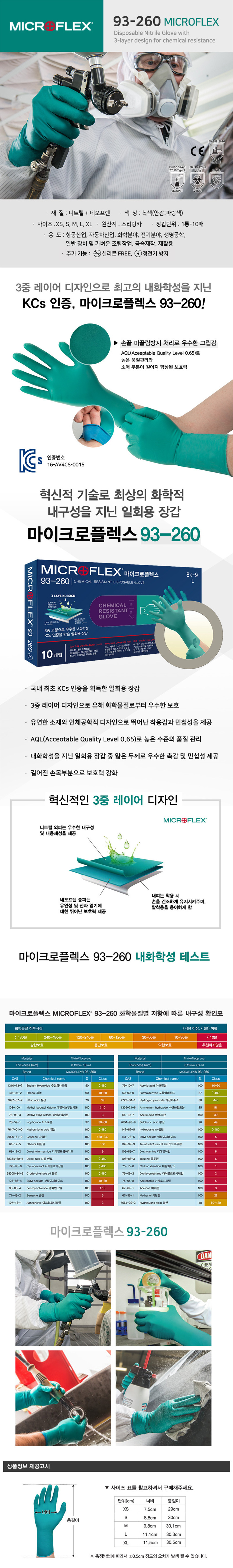 안셀 마이크로플렉스 내화학 장갑 93-260 10매입 일회용 네오프렌 고무 라텍스 케미컬 실험실 병원