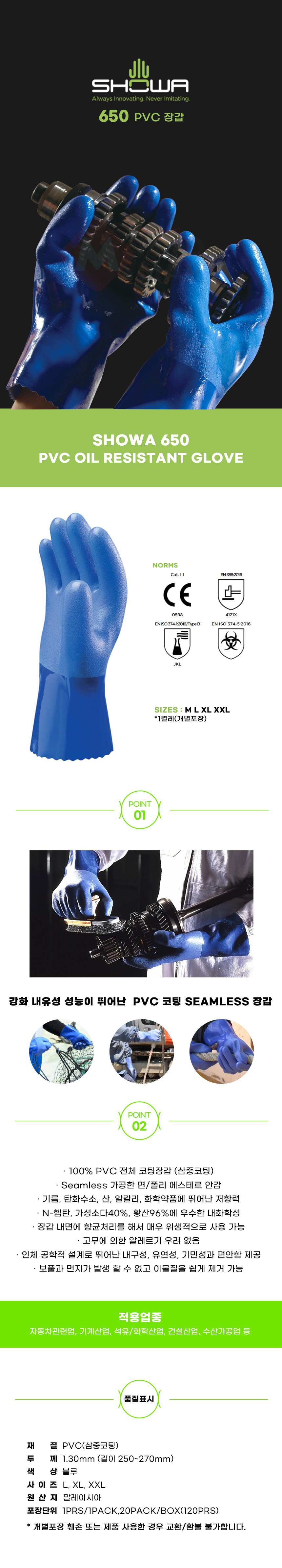 쇼와 650 PVC 내유 방수 내화학 PVC 장갑
