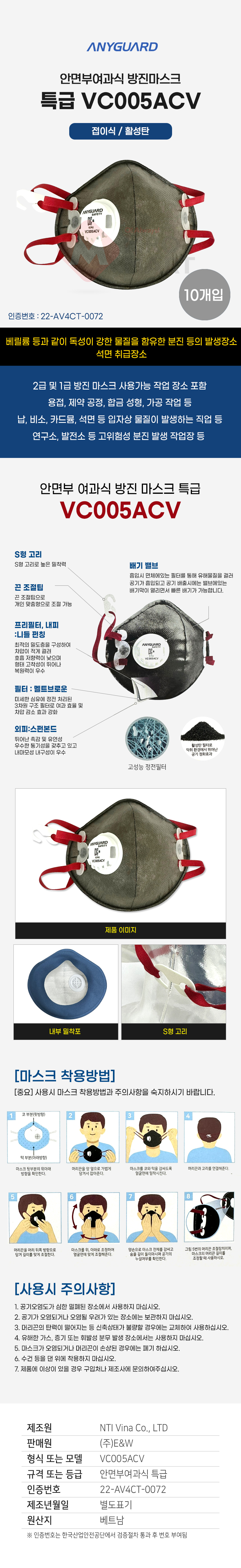 애니가드 VC005ACV 특급 10개입 안면부 여과식 방진 마스크 활성탄 접이식 산업용 공업용