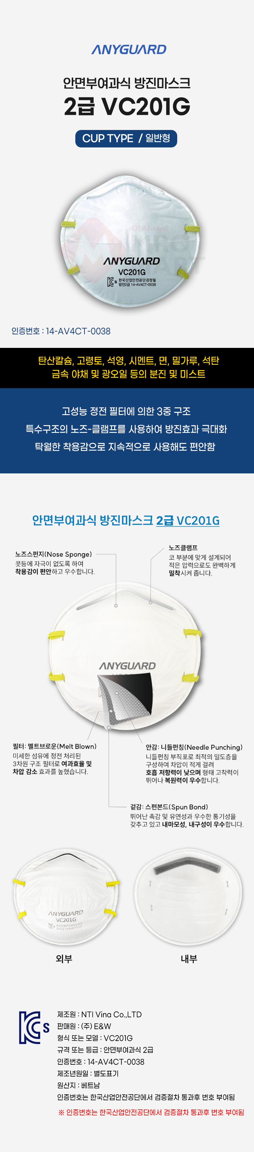 애니가드 VC201G 안면부여과식 방진 마스크 2급 일반형 산업용 공업용(낱개입)