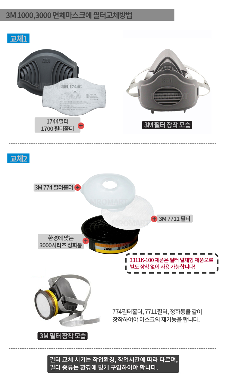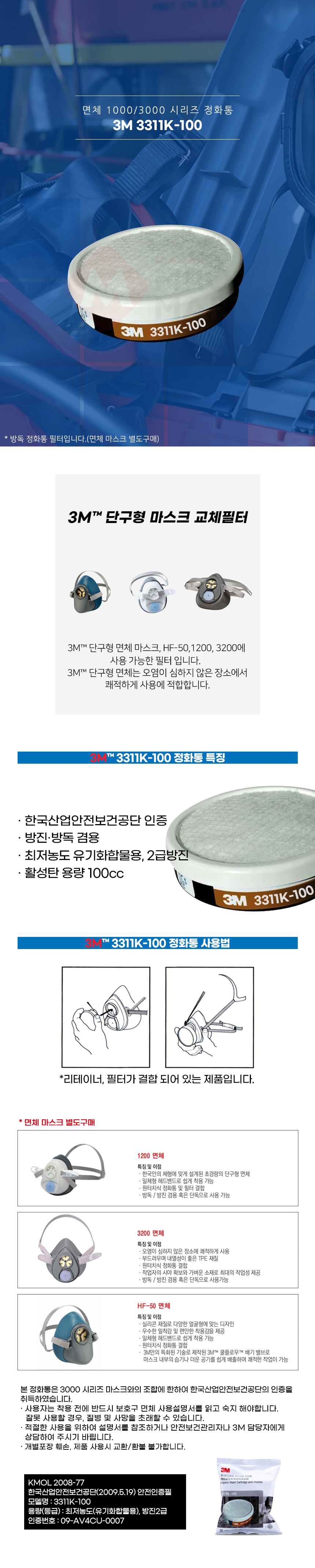 3M 3311K-100 정화통 필터 방독 면체 마스크 단구형 교체 유기증기
