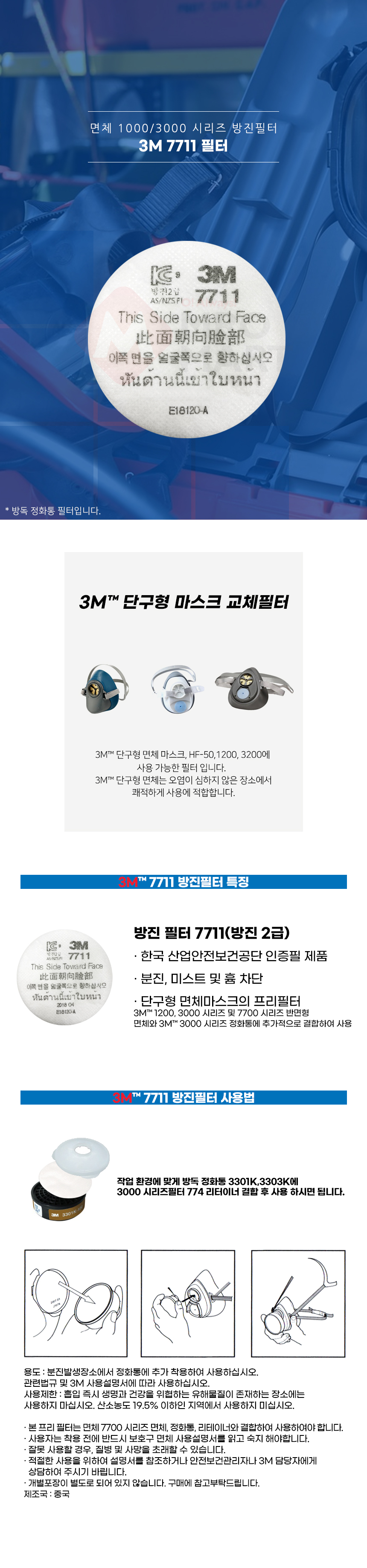 3M 7711 2급 방진 프리 필터 면체 마스크 단구형 교체