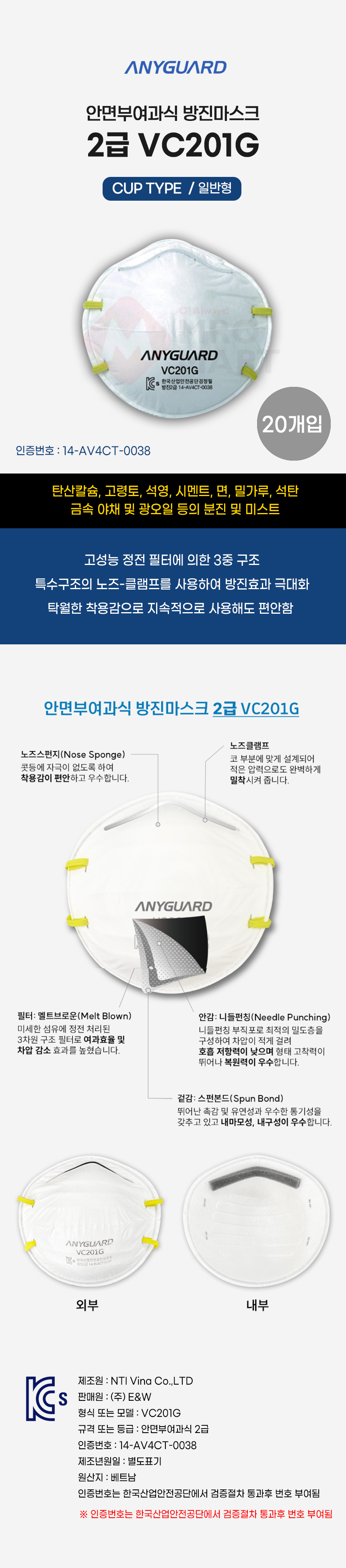 애니가드 VC201G 안면부여과식 방진 마스크 2급 일반형 산업용 공업용 (20개입)
