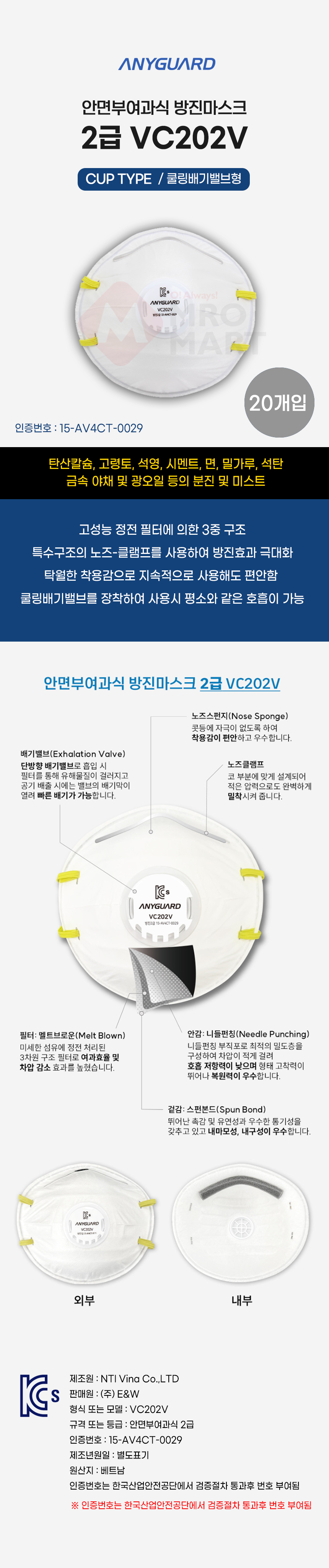 애니가드 VC202V 안면부여과식 방진 마스크 2급 밸브형 산업용 공업용 (20개입)