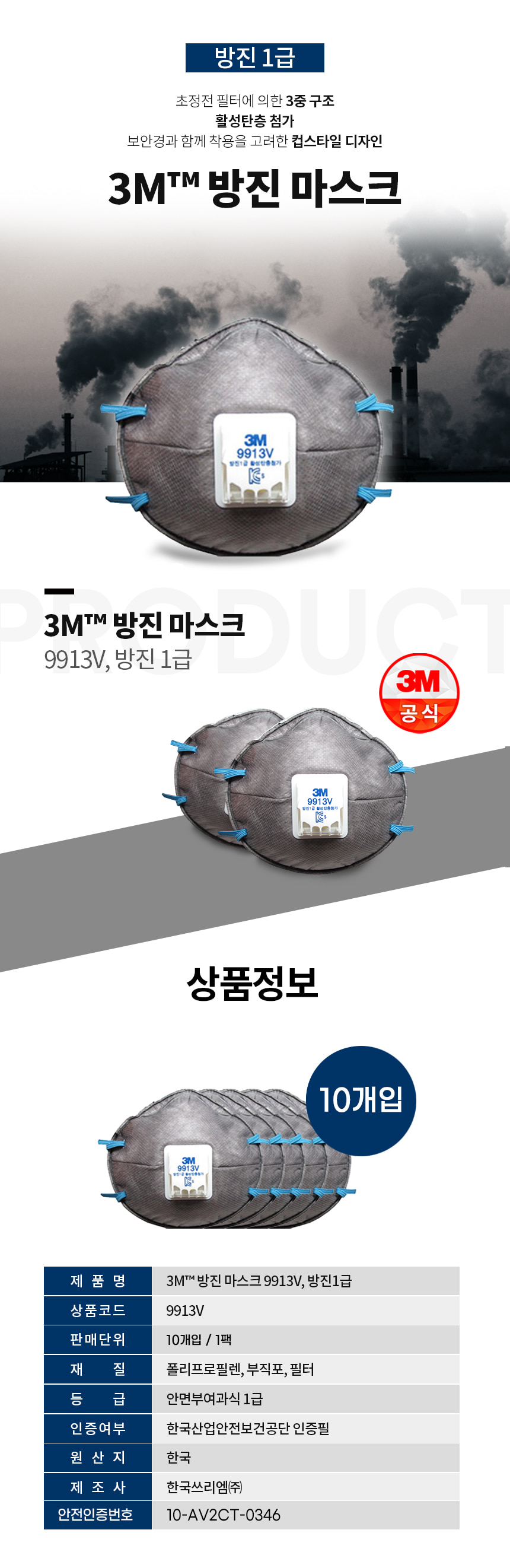 3M 안면부여과식 방진 마스크 9913V 방진1급 10개입 활성탄 냄새 제거 분진 미스트 용접흄 공업용 산업용