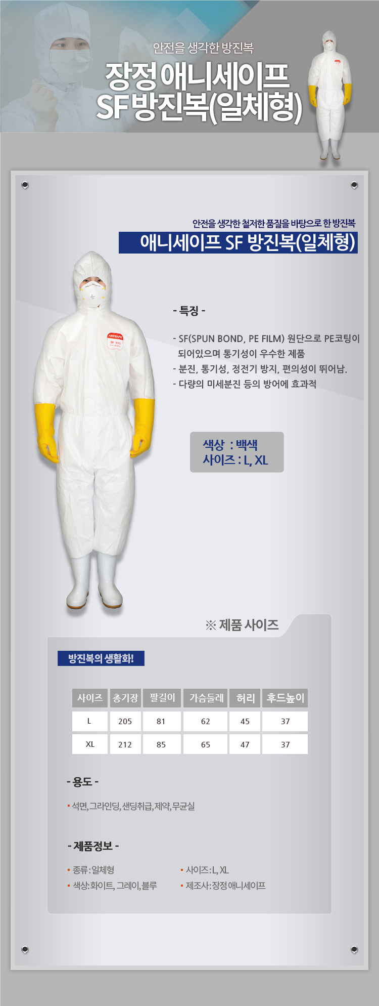 장정 애니세이프 SF 방진복 화이트 일체형 원피스 보호복 방제복 방역복 제전복 L XL