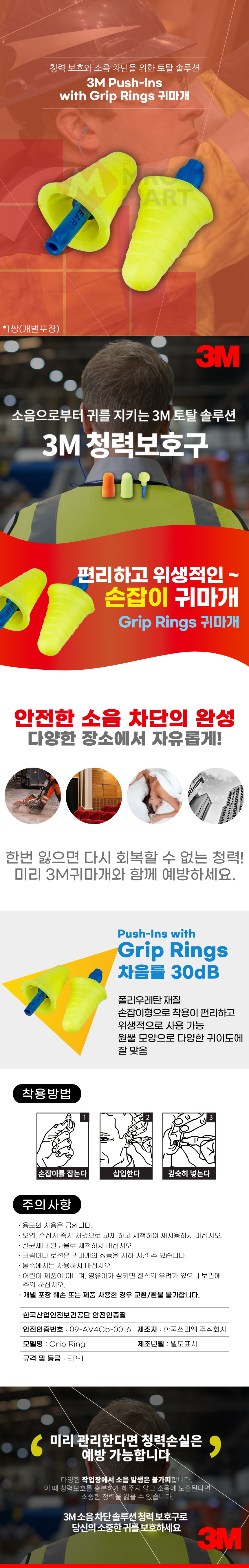 3M Push-ins Grip Rings 손잡이 귀마개 이어플러그 청력보호구 수면 소음 공부