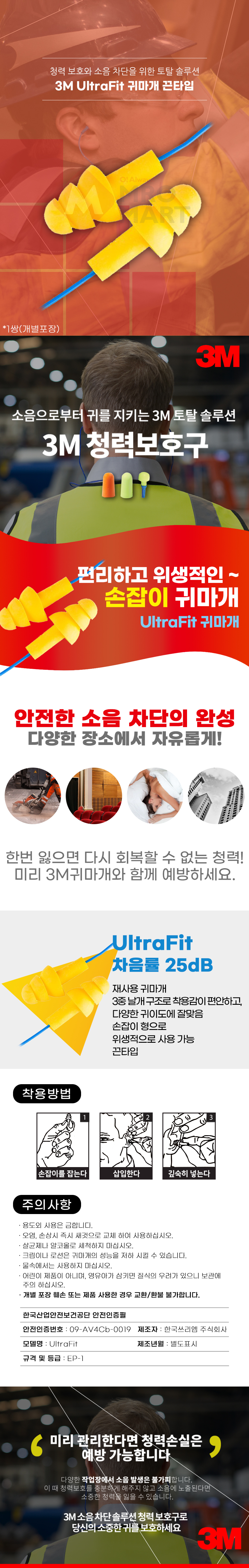 3M UltraFit 귀마개 끈타입 이어플러그 청력보호구 수면 소음 공부