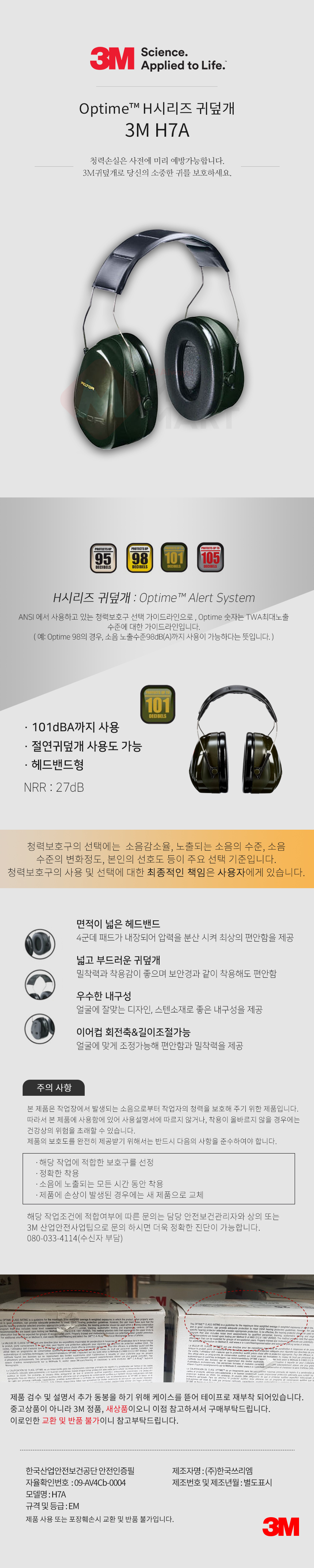 3M 귀덮개 H7A Ear Muffs 청력 보호구 헤드폰형 산업용 공업용 소음 차단 귀마개 27dB