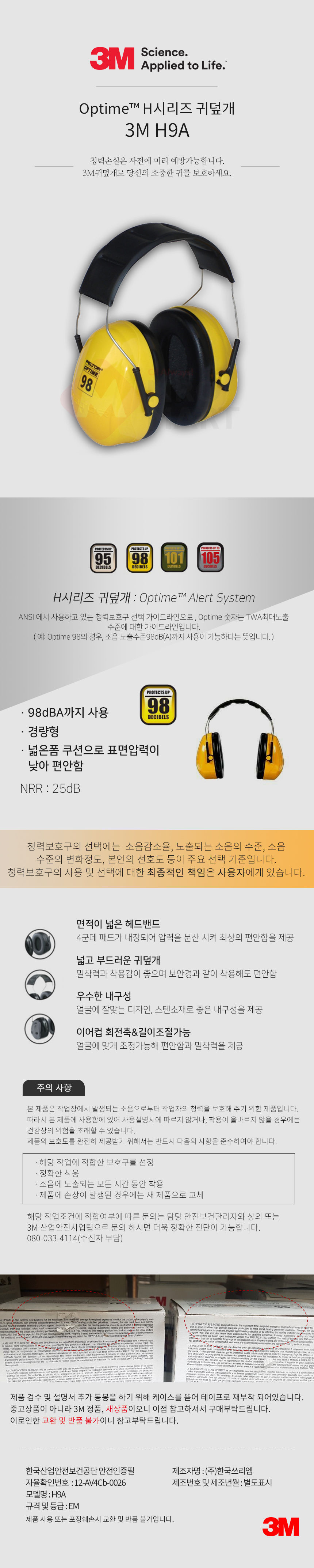 3M 귀덮개 H9A Ear Muffs 청력 보호구 헤드폰형 산업용 공업용 소음 차단 귀마개 25dB