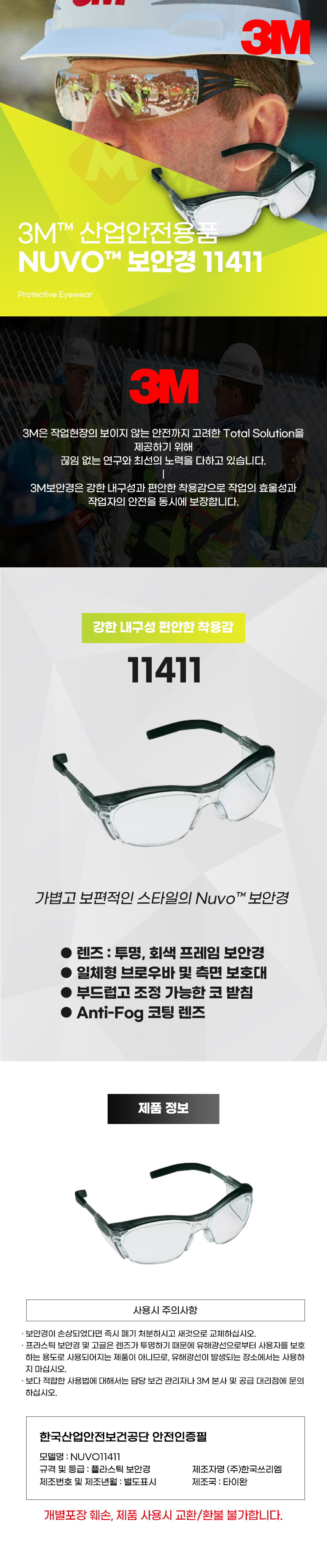 3M NUVO 11411 투명 보안경 산업 안전 보호 안경 김서림 방지